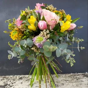 Semplice bouquet dai colori pastello, primaverile e profumato. I fiori predominanti in questo omaggio floreale sono la fresia ed i ranuncoli, fiori per eccellenza primaverili. Ideale per gli auguri di Pasqua, per un nascita, per un’amica preziosa.