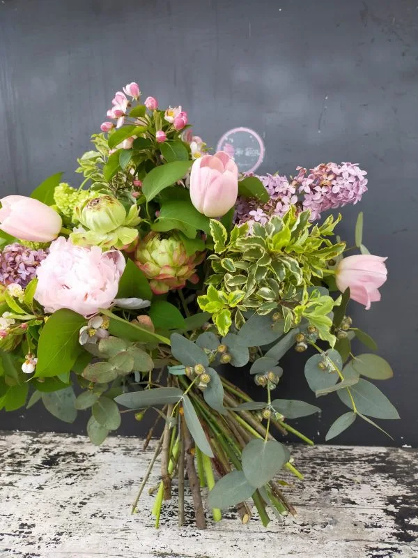 Peonie morbide e avvolgenti, ranuncoli raffinati, tulipani leggeri, profumato lillà e un tocco di verde decorativo si intrecciano in un equilibrio armonioso, perfetto per trasmettere emozioni profonde senza bisogno di parole.
